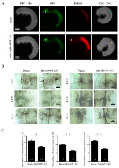 2.2. BmMMP1 Is Required for Tracheal Branch