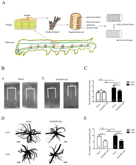 The silkworm trachea consists of a basal cell surface, epithelium, apical cell surface, and taenidium (Figure 3A), while the cuticle of the silkworm trachea, which consists of the apical cell surface and taenidium, is an important part to control tracheal extension, and the expansion of cuticle depends on the taenidial spacing expansions [24]. We observed tracheal taenidial expansion of WT (a) and BmMMP1-KO (b) in the fourth larval instar, because the trachea is bigger than that of the third instar for ease of operation and the fifth instar is not complete for BmMMP1-KO. In WT, the intertaenidial distance of the third day of the fourth larval instar (L4D3) or late L4 was wider than the first day of the fourth larval instar (L4D1) or early L4, but it was not in the BmMMP1-KO line (Figure 3B). On top of the observed differences observed, further statistical analysis was made. We measured the intertaenidial distances (a) by calculating the number (b) of taenidia in 50 (μm), using the equation, a = 50/b (μm). There was also no significant difference between early L4 and late L4 in BmMMP1-KO line, while the intertaenidial distance in late L4 is significantly wider than early L4 in WT (Figure 3C). The results shown that knockout BmMMP1 impaired the ability of the tracheal taenidium to expand.