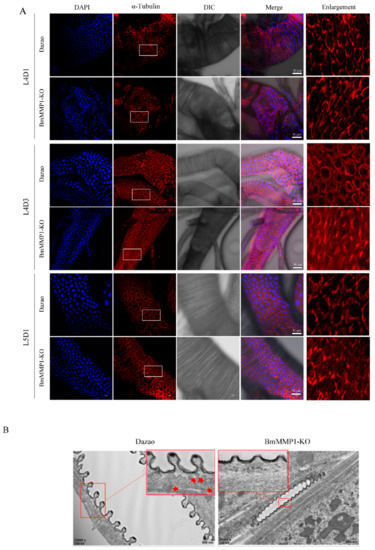 Knockout of BmMMP1 decreases epidermal cell spacing and breaks the structure of apical membrane in trachea. (A) Immunofluorescence assay of trachea in L4D1, L4D3, and L5D1. DAPI (Blue) stained cell nucleus, α-Tubulin (Red) stained cytoskeleton. (B) Remodeling of tracheal apical membrane observed by TEM. The big red box is a magnification of the small box and the red arrows indicate apical membrane protrusions.
