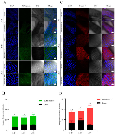 Combined with the structural and developmental characteristics of silkworm trachea, we analyzed the different phenotypes of the mutants, and found that the morphology, noncellular structure and tracheal cell were all changed, and final rendering the number of tracheal branches decreased. Since the tracheal tissue has a single layer of cells and all other components were regulated by them, the growth and development of tracheal cells are particularly important for the study of BmMMP1 regulating tracheal branching [25]. We investigated the connections between tracheal cells and the basement membrane. The expressions of DE-cadherin and Integrin β1 in the silkworm trachea at the L4D1, L4D3 and L5D1 were detected by immunohistochemistry, which also allowed us to explore the development of the trachea in one larval instar and to observe the changes before and after the larval molts. The expressions of DE-cadherin and Integrin β1 were higher than WT in BmMMP1-KO (Figure 5A–C). We analyzed all fluorescence expressions by ImageJ (Figure 5B–D). The absence of BmMMP1 led to the inhibition of DE-cadherin and Integrin β1 degradation. As a result, it is speculated BmMMP1 cleaves DE-cadherin and Integrin β1 to affect tracheal branch development in the silkworm.