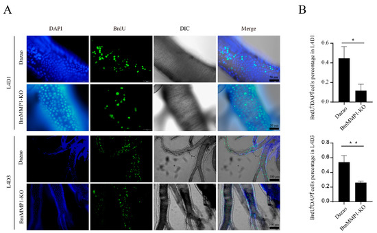 BmMMP1 affects the silkworm tracheal cells proliferation. (A) The proliferation activity of trachea cells by BrdU labeling assay in L4D1 and L4D3. DAPI (Blue) stained cell nucleus and green fluorescent signal BrdU positive cells or BrdU+ cells. Different magnification was selected for the two experiments. (B) The ratio statistics of BrdU+ cells to DAPI+ cells. (*, 0.01 ≤ p < 0.05; * *, p < 0.01).
