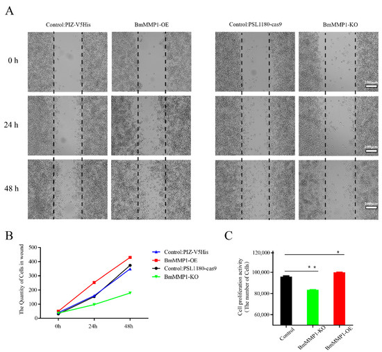 Briefly, 1 × 105 BmNS cells/well in 6-well plates were allowed to reach a confluency of nearly 80% and a wound was created with a pipette tip after transfected 48 h. Cells were washed with 1× PBS to remove cell debris. Furthermore, cells were cultured in TC-100 insect medium and were observed in 0 h, 24 h, and 48 h.