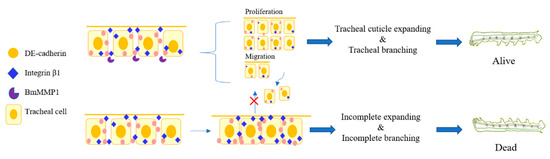 In conclusion, BmMMP1 widened the cell spacing and carried out proliferation and migration through degradation of DE-cadherin and Integrin β1. This led to cell depolymerization, tracheal cuticle expansion, and ultimately promoted the increase of tracheal branches after each molt (Figure 8). The remarkable metamorphosis of insects is closely related to adapt to the complex environments. Therefore, systematic study of the influence of BmMMP1 during tracheal development has important practical significance for expanding insect resource utilization and pest control. The present researches provide a good foundation for conducting detailed studies on the molecular mechanisms involved in the regulation of silkworm trachea by BmMMP1.