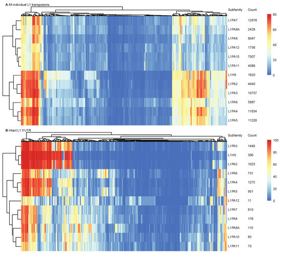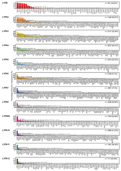 | L1 Subfamily | Total Number of Intact 5′ UTR | Number (%) of 5′ UTRs with TFBSs |