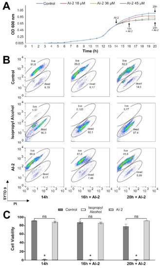 To verify whether AI-2 exhibits toxicity against Z. mobilis cells, a flow cytometry assay, employing the LIVE/DEAD® BacLigh® Bacterial Viability Kit, was conducted at the same experimental conditions (see Materials and Methods, for details). This assay uses two fluorochromes that bind to nucleic acids, SYTO 9, and propidium iodide (PI). SYTO 9 is a cell-permeant green fluorescent dye that labels live and dead bacteria, whereas PI, as a cell-impermeant red fluorescent dye, only enters into bacterial cells with altered membrane permeability (damaged/dead). The binding of PI to nucleic acids results in an apparent diminished green fluorescence of SYTO 9, due to quantum yielding, when both fluorochromes are inside the cells, allowing visual separation of viable cells (containing intact membranes), from membrane-compromised/dead bacteria [10]. In this assay, isopropyl alcohol was used to promote a positive control for cell damage/death, as indicated in the manufacturer’s instructions (see Materials and Methods). Based on the position of cell populations in both untreated controls and alcohol-treated experiments, a gate-based strategy was used to distinguish between live and damaged/dead cells. The representative dot plots presented in Figure 1B show that AI-2 did not alter the viability of Z. mobilis cells, when AI-2-treated cells were compared to the negative control (absence of AI-2). The quantification of the percentages of live and dead/damaged cells is presented in Figure 1C, considering a total of three independent replicas. Thus, these data show that the decreased growth rate induced by AI-2 does not seem to be due to AI-2 toxicity.