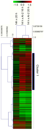 Total RNA was extracted from the bacteria harvested at the abovementioned timepoints and used to construct RNA-seq libraries. All transcriptome comparisons were made using the transcriptome of untreated cells, at mid-exponential growth phase (t = 14 h) as a common reference, resulting in three pairs of comparisons: (i) t = 20 h × t = 14 h; (ii) t = 16 h + AI-2 × t = 14 h and (iii) t = 20 h + AI-2 × t = 14 h. As highlighted in Materials and Methods, all analyses were conducted with results obtained from three independent cultures, obtained for each experimental condition. The complete dataset derived from the RNA-seq analyses can be found at the Open Science Framework (OSF) repository (https://osf.io/rs8pu/, accessed on 25 April 2021). Differentially expressed genes were identified by ANOVA, followed by a Benjamini–Hochberg (BH) post-test, using q ≤ 0.01 as the limit for statistical reliability. Additionally, only genes displaying absolute log2 modulation ≥ 0.6, in at least one experimental timepoint, were considered for further analyses (this threshold is equivalent to >50% up, or down-regulation, in comparisons with gene expression values at t = 14 h). These conditions led to the identification of 724 genes, whose modulation patterns are shown in Figure 2 (details concerning gene identities are provided in the Supplementary Materials File S1). To verify the overall reliability of the RNA-seq results, a set of 20 genes had their relative expression ratios confirmed by qPCR and a qualitative comparison of the results obtained by these two methodologies indicate that ~80% of them were equally identified as either induced, or repressed, by these two independent approaches (see Supplementary Materials File S2).