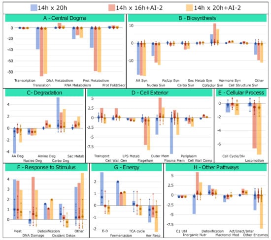 A prospective evaluation of the Z. mobilis functional/structural response to AI-2, at different growth conditions, was obtained by comparing the expression profile of the 724 genes observed in Figure 2 with the OMICS Dashboard tool, available through the Pathway Tools software (https://arxiv.org/abs/1510.03964, accessed on 20 June 2020). Thus, genes were initially distributed into their respective Gene Ontology (GO) categories [12] and grouped in specific structural/functional systems/subsystems, according to the Z. mobilis ZM4 Pathway/Genome Database (PGDB), available at the BioCyc repository (https://biocyc.org/, accessed on 20 June 2020). Expression ratios for each categorized gene are shown in Figure 3, along with the overall modulation of each system/subsystem, which is represented by the sum of relative expression ratios of their individual genes (detailed information regarding individual genes present in each system/subsystem can be found in the Supplementary Materials File S3).