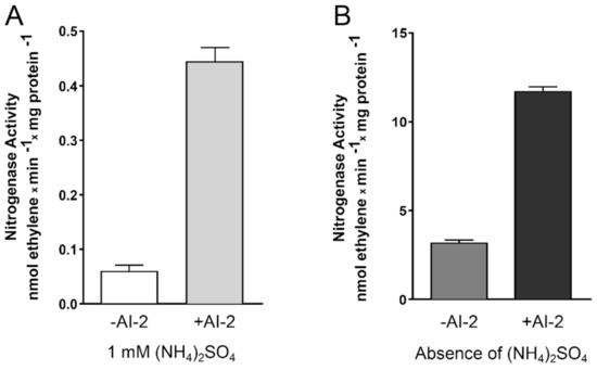 To verify if the AI-2-induced modulation verified in the abovementioned genes really affects nitrogen fixation in Z. mobilis, cultures of this bacterium were subjected to an acetylene reduction assay (ARA), the conventional methodology used to measure nitrogenase activity in bacterial cells [14]. In this assay, bacterial nitrogenase activity reduces acetylene (C2H2) to ethylene (C2H4), which is then measured by gas chromatography (see Materials and Methods for details). As observed in Figure 5, Z. mobilis cells incubated in the presence of 45 µM AI-2 showed a significant increase (~4–8×) in nitrogenase activity, when compared to cells incubated in the absence of this auto-inducer. Interestingly, N2 fixation appears to be stimulated by AI-2 both in the presence, or absence, of fixed nitrogen (NH4+) in the culture medium, although total enzyme activity is reduced in the first condition, as previously observed in other diazotrophic bacteria [15].