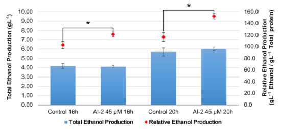 Ethanol production by Z. mobilis in response to AI-2. Cultures of Z. mobilis were established, as described in Figure 1 and grown for 14 h, until they reached mid exponential growth phase. At this time, AI-2 was added, at 45 µM final concentration, and the cultures were further incubated for additional six hours, until they all reached stationary growth phase. Aliquots (2 mL) were collected at times t = 16 h and t = 20 h for ethanol quantification, using the EnzyChrom® Ethanol Assay kit, and to quantify total protein accumulated in the bacterial biomass, at these different timepoints (see Materials and Methods for details). Blue bars display the absolute ethanol concentration in each sample (left axis), while the red dots display their relative ethanol production, normalized by biomass accumulation (right axis). The graph shows the average results and their respective SEMs, obtained from three independent experiments. * represents statistically significant differences in relation to the respective controls (AI-2 untreated cultures), after a two-tailed t-test, using p < 0.05 as a threshold.