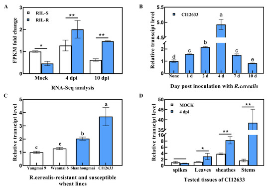All wheat plants were grown in a greenhouse under 23 °C/14 h light and 15 °C/10 h dark. At the tillering stage, the stem base of each plant was inoculated with toothpick fragments harboring well-developed mycelia of R. cerealis. The inoculated sites were covered with wet cotton to increase the humidity, which promotes R. cerealis infection. Inoculated plants were grown at 90% relative humidity for 4 days. At 4- and 10-dpi with R. cerealis Rc207 or mock inoculation, nine plants derived from three resistant RILs and three susceptible RILs were sampled for deep RNA-sequencing and comparative transcriptomic analysis. The sequences of all primers in this study are listed in Table S1.