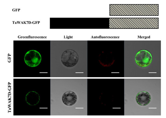 Subcellular localization of TaWAK7D in wheat protoplasts cells. The control GFP and fused TaWAK7D–GFP are transiently expressed in mesophyll protoplasts cells. The red colour was auto-fluorescence from wheat chloroplast. Scale bars = 20 μm (wheat protoplasts).