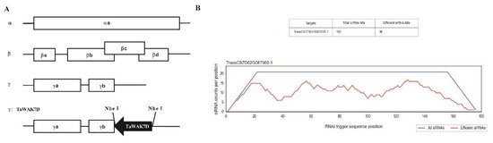 Schemata of recombinant BSMV:TaWAK7D construct and si-Fi software off-target prediction. (A) Schemata of recombinant BSMV:TaWAK7D construct. The orientation of the TaWAK7D insert is indicated by dark box. (B) SIFI software off-target prediction results.