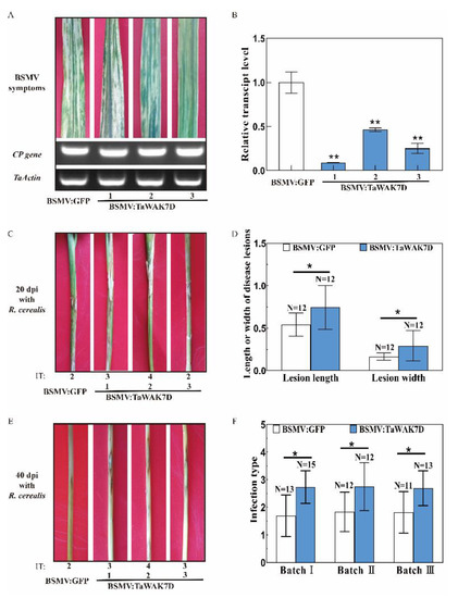 Barley stripe mosaic virus (BSMV)-mediated VIGS has been successfully utilized to study gene function in barley and wheat [40]. In this study, a175bp fragment of TaWAK7D 3′–UTR was subcloned in antisense orientation into the Nhe I restriction site of the RNA γ of BSMV, to form a BSMV:TaWAK7D recombinant vector (Figure 4). Then, the tripartite cDNA chains of BSMV:TaWAK7D or the control BSMV:GFP virus genomes were separately transcribed into RNAs, mixed and used to infect CI12633 seedlings at the three-leaf stage. At 15 dpi, the fourth leaves of the inoculated seedlings were collected to monitor BSMV infection, to analyze the transcription of BSMV CP gene and to evalued the relative transcript change of TaWAK7D in BSMV:GFP or BSMV:TaWAK7D wheat plants.