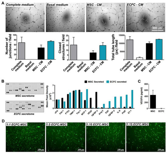 Angiogenic effects of MSC and ECFC. (A) Phase-contrast microscopy images showing vascular networks of endothelial cells assembled on Matrigel in the presence of MSC- and ECFC-CM. The diagrams illustrate comparable effects of the MSC- and ECFC-CM in terms of the number of junctions, total tube length, and closed structures formed by endothelial cells in one representative experiment performed in duplicates; (B) proteomic screening of cytokines secreted by MSC and ECFC in vitro, as assessed by Human Angiogenesis Proteome Profiler array; (C) ELISA quantification of VEGF in MSC and ECFC secretomes; (D) tube-like structures formed by fluorescent ECFC when co-cultured with unlabeled MSC in different cell ratios.