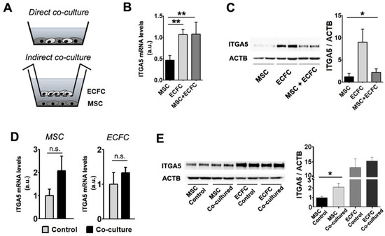 Gene and protein expression modulation following MSC + ECFC co-culture. (A) Schematics of the experimental settings used for MSC + ECFC direct contact (upper image) and indirect co-culture (lower image). (B) Gene expression analysis of ITGA5 in individual cultures and MSC + ECFC direct co-culture, indicating the induction after co-culture. (C) Western blot showing protein levels of Integrin alpha-5 subunit after direct MSC–ECFC interaction. (D) Gene expression analysis of ITGA5 in MSC (left side) and ECFC (right side), in individual cultures (control) and after indirect-contact co-culture. (E) Western blot showing ITGA5 protein level in MSC and ECFC following indirect contact co-culture. Data are mean ± SD. (Statistics: one-way ANOVA followed by Tukey’s multiple comparison test and two-tailed, paired t test; * p value < 0.05; ** p value < 0.01).
