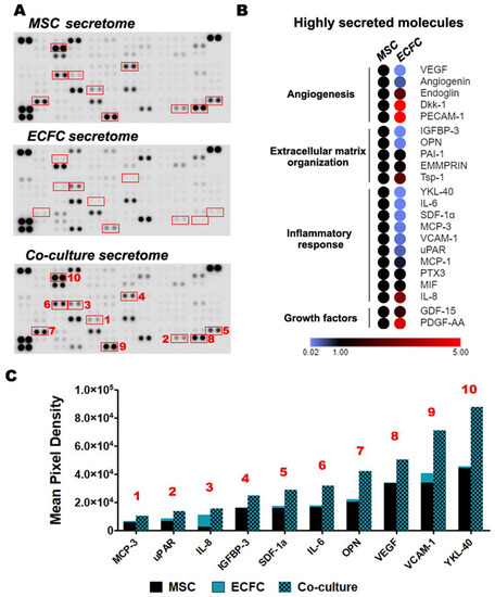 Proteome array analysis of the secretome produced by MSC and ECFC co-cultured in direct contact. (A) Secretory profiles of MSC, ECFC, and MSC + ECFC co-cultures were identified by antibody-based Human XL Cytokine Array. Shown in red are proteins whose cumulative levels were induced following co-culture as compared to their expected levels; (B) heatmap representation of the highly secreted cytokines, illustrating the major secretion source and biological processes associated to the cytokines; (C) the relative levels of proteins in the co-culture supernatant, which were found to be induced by more than 35% after MSC-ECFC co-culture.