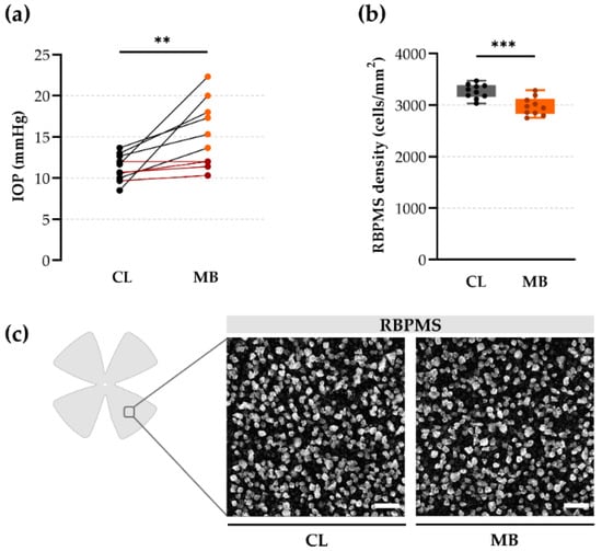 Intracameral microbead injection led to a mild glaucoma phenotype. (a) Intraocular pressure (IOP), measured with a rebound tonometer, was increased in microbead-injected eyes at two weeks post-injection, in comparison to the contralateral eyes. Of the 10 mice, 4 did not show elevated IOP (defined as an IOP lower than the mean IOP value of the contralateral eye + one standard deviation) (shown in red). Unpaired two-tailed t-test, ** p ≤ 0.01, n = 10. (b) RGC density of entire RBPMS-stained flatmounts was calculated by an automated deep learning tool (RGCode) [13] and revealed a mild RGC loss at five weeks post-injection, as compared to contralateral eyes. Unpaired two-tailed t-test, *** p ≤ 0.001, n = 10. (c) Representative photomicrographs of mid-peripheral regions of RBPMS-stained flatmounts revealed no evidently visible changes in RGC densities across contralateral control and microbead-injected eyes. Scale bar = 50 µm. CL = contralateral eyes and MB = microbead-injected eyes.