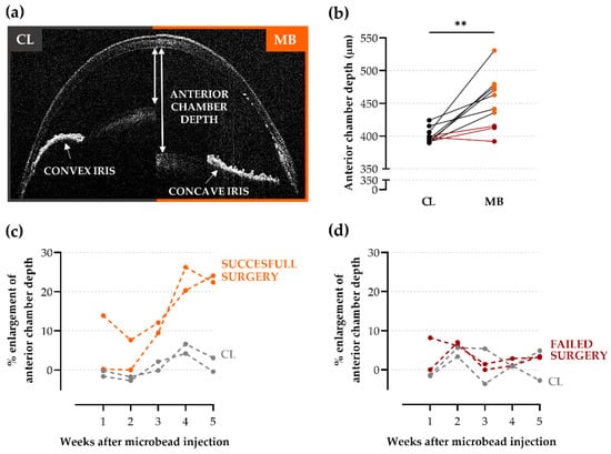 Optical coherence tomography (OCT) of the anterior segment at five weeks after microbead injection. (a) Representative anterior segment OCT images of a microbead-injected (right panel, “MB”) and contralateral (left panel, “CL”) eye after pupil dilatation. The measurements of the anterior chamber depth (i.e., the distance between the corneal endothelium and the anterior surface of the lens) are indicated, together with a clear example of a convex iris in a naïve eye vs. a concave, flattened iris after microbead injection. (b) Quantification of the anterior chamber depth at five weeks post-injection revealed a substantial enlargement (13 ± 3%) in microbead-injected eyes as compared to the control eyes. Of the 10 mice, 3 did not show elevated anterior chamber depth (defined as anterior chamber depth smaller than the mean anterior chamber depth of the contralateral eye + one standard deviation) (shown in red). Unpaired two-tailed t-test, ** p ≤ 0.01, n = 10. (c,d) Representative graphs of longitudinal anterior chamber depth follow-up showing the percentage of anterior chamber depth enlargement of mice with a successful (c) and failed (d) microbead surgery, both in comparison to the contralateral eyes. CL = contralateral eyes and MB = microbead-injected eyes.