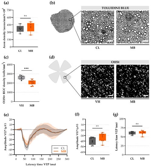 Axonal stress at five weeks after microbead injection. (a) Axon density was calculated by an automated deep learning tool (AxoNet) [15] and revealed an unaltered density in the distal optic nerve (3 mm after optic nerve head) upon microbead injection. Unpaired two-tailed t-tests, ns = non-significant, n = 5. (b) Representative images of semi-thin optic nerve cross-sections (contralateral vs. microbead-injected optic nerves) revealed no clear signs of axon degeneration. Scale bar = 5 µm. (c) OHSt-labeled (OHSt+) RGC density after retrograde tracing from the superior colliculus was calculated by an automated deep learning tool (RGCode) [13] on entire flatmounts and revealed that axonal transport was notably disrupted in microbead-injected eyes as compared to vehicle-injected controls. Unpaired two-tailed t-test, *** p ≤ 0.001, n = 10. (d) Representative images of mid-peripheral retinal regions after retrograde OHSt tracing revealed a diminished number of OHSt+ RGCs after microbead injection. Scale bar = 50 µm. (e) Average (± CI95%) full-field flash visually evoked potential (VEP) responses indicated a non-significant but slightly decreased amplitude upon microbead injection as compared to contralateral controls. (f,g) The amplitude and latency of the VEP response remained unaltered upon microbead injection. Unpaired two-tailed t-test, ns = non-significant, n = 8. CL = contralateral eyes, VH = vehicle-injected eyes, and MB = microbead-injected eyes.