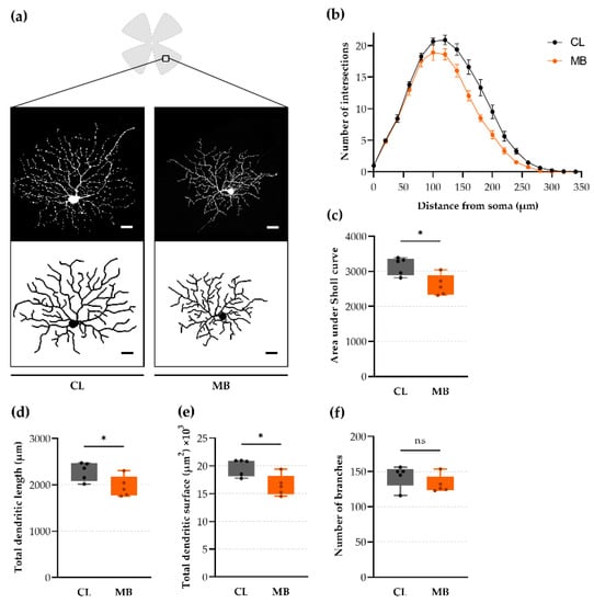 Dendritic architecture was affected by microbead injection. (a) Z-stack projection of αRGCs (SMI32-immunopositive) from a Thy1-YFP-H sparsely labeled mouse in the peripheral retina, together with the corresponding en-face view of the dendritic tree, traced with Matlab’s TREES toolbox. Scale bar = 20 µm. (b,c) Average (± SEM) Sholl profiles (b) (i.e., the number of dendrites intersecting concentric circles with a radius increment of 20 µm) and area under the Sholl curve (c) revealed dendritic retraction upon microbead injection. (d–f) Dendritic arbor analysis revealed a markedly lower dendritic length (d) and tree surface (c), whilst a trend towards a lower number of branches was observed (e). Unpaired two-tailed t-tests, ns = non-significant, * p ≤ 0.05, n = 5. CL = contralateral eyes and MB = microbead-injected eyes.