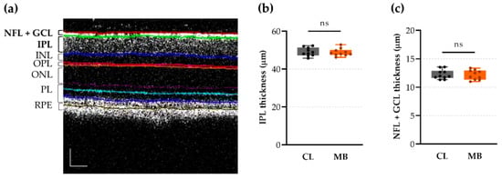 In vivo quantification of retinal layer thickness via optical coherence tomography (OCT) revealed no changes at five weeks after microbead injection. (a) Representative OCT image with colored lines indicating the borders of different retinal layers. Scale bar = 50 µm. (b) The inner plexiform layer (IPL) thickness was unchanged upon microbead injection. Unpaired two-tailed t-test, ns = non-significant, n = 10. (c) Similarly, the thickness of the combined nerve fiber and ganglion cell layers (NFL + GCL) remained unaltered after microbead injection. Unpaired two-tailed t-test, ns = non-significant, n = 10. CL = contralateral eyes and MB = microbead-injected eyes.