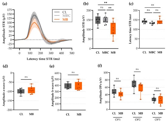 Scotopic threshold response (STR) and full-field flash electroretinogram (ERG) recordings five weeks after microbead injection. (a) Average (± CI95%) STRs showed a decreased amplitude upon microbead injection. (b,c) Bar graphs showing a decreased mean STR amplitude and unaltered mean STR latency time in microbead-injected eyes vs. contralateral and microbead-injected controls. One-way ANOVA test with Tukey’s post-hoc tests, ns = non-significant, ** p ≤ 0.01, n = 10. (d–f) Bar graphs showing components of the full-field flash ERG, generated primarily by photoreceptor (a-wave, (d)), Müller/ON-bipolar (b-wave, (e)), and amacrine (oscillatory potentials, OPs, (f)) cells, revealing unaltered responses of other retinal cells. Unpaired two-tailed t-tests (d,e) or one-way ANOVA test with Tukey’s post-hoc tests (f), ns = non-significant, n = 8. CL = contralateral eyes, MBC = microbead-injected control eyes without microbead repositioning towards trabecular meshwork, and MB = microbead-injected eyes.