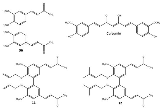 In the past years, our group has developed a new compound, a hydroxylated biphenyl, structural analog of curcumin, the α,β-unsaturated ketone called D6, for which an antitumor effect has been demonstrated at concentrations around 2 μM against melanoma and neuroblastoma, both in vitro and in vivo on animal models []. This compound was shown to act by inhibiting cell proliferation through cell cycle arrest in the G2-M transition and by inducing the apoptotic process through the involvement of the intrinsic pathway and activation of caspases. Noteworthy, the D6 compound showed low toxicity in the preclinical models. Expression profiling unveiled an interesting involvement of proapoptotic pathways for D6 [,] and, taking all our results together, we considered it an excellent candidate for developing a new multitarget therapeutic agent against melanoma. However, its activity needed to be improved. The low solubility of this compound in physiological solutions initially created difficulties in administering it to mice during the in vivo testing phase. Trying to overcome this problem, our group synthesized a battery of D6-like compounds to be tested for their biological activities, solubility, and bioavailability to optimize their anticancer potentiality [].