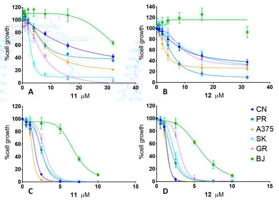 Antiproliferative activity: Cells were cultured with increasing concentrations (0.5–32 μM) of either 11 (A,C) or 12 (B,D) up to 24 h (A,B) or 72 h (C,D). Cell proliferation values were calculated as the growth percentages of treated cells compared to the untreated ones. Graphs represent the curves extrapolated [] by the nonlinear regression of a variable slope (four parameters), with GraphPad Prism (v. 7.00) for the results of three experiments, each done in triplicate, ± the standard deviation, as described in Materials and Methods.