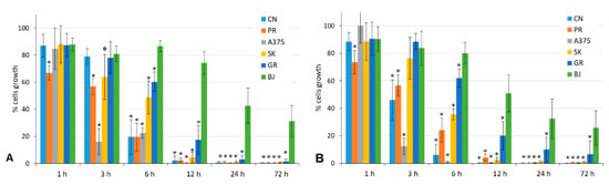 To test the time dependence and point out the efficacy and the long-term effects of the antiproliferative activity of 11 and 12 on the melanoma cells, we performed wash-out proliferation assays. Cells were grown in the presence of 11 or 12 for variable times, then washed and grown in complete culture medium up to 24 h (T24; Figure S3) or 72 h (T72; Figure 3). These assays allow us to determine the shortest treatment time necessary to obtain an effective antiproliferative activity on the tumor cells. They also evaluate the reversibility of the tested compound effect. Considering the IC50 values reported in Table 1, the cells were treated with a 5-μM dose of either the 11 or 12 compound for 6, 12, and 24 h (T24; Figure S3) and for 1, 3, 6, 12, 24, and 72 h (T72; Figure 3). The T24 point of the experiment (Figure S3) showed that the initial activity of 11 and 12 were already evident, especially on A375 cells, inhibiting the proliferation during short times of exposure (6 h) and still visible at the end of the experiment, a total of 24 h. The most significant results were obtained during the T72 point of the experiment. As shown in Figure 3A,B, some more sensitive cell lines showed the effect of both compounds after only 1–3 h of treatment (PR after 1 h and A375 and SK after 3 h), and even after the reconstitution of the complete medium, those cells did not reacquire the proliferation activity. After 6 h of treatment, all the MM cell lines were highly inhibited, while the BJ fibroblasts kept growing, and at the end of the 72-h experimental time, the MM cells showed 40–80% growth inhibition vs. about 10–20% inhibition shown by the BJ fibroblasts (p ≤ 0.001). After 12 h of treatment, at the end of 72 h, cell proliferation was almost abolished (0–20%) in all the MM cells, while, for the fibroblasts (BJ), it was only decreased to 74% by 11 and to 51% by 12 (p ≤ 0.001). These results demonstrate the high selectivity of compounds 11 and 12 toward tumor cells in treatments for up to 12 h of continuous exposure to the drug.