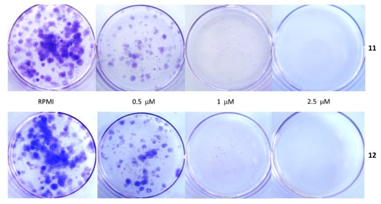 Clonogenic assays were conducted using two experimental conditions: (A) cells growing in liquid medium and treated for 4 h (wash-out) or continuously for 14 days and (B) cells growing in semi-solid media (soft agar) treated continuously for 14 days. MM cell lines were first characterized for their clonal growth capability and optimal seeding density (cells/mL) in both liquid (A) and semi-solid mediums (B). Briefly, sample (A) cells were seeded in a 12-well plate at different concentrations (cells/mL) and grown for 14 days. Then, colonies in each well were stained, counted, and photographed, as described previously []; for sample (B), cell suspensions were mixed with 0.3% agarose in RPMI and plated on 2-mm gridded, 6-cm Petri dishes having a bottom layer (0.5% agarose in RPMI medium) freshly solidified. As soon as the top layer became solid, the Petri dishes were incubated at 37 °C in a CO2 incubator for 14 days. Colonies inside 10 grids (4 mm2 each) were counted through optical inverted microscope observation. The final number, expressing the tumorigenic capacity of each cell line, was elaborated as a percentage of the colonies counted compared to the number of cells initially seeded []. Once we established the optimal cell density for each cell line, we proceeded by performing dose/response experiments for both 11 and 12. Cells grown in liquid medium (A) were treated with 0.5, 1, 2.5, 5, and 10 μM of 11 or 12 for both the wash-out (4 h) and continuous treatment (up to 14 days; treatments every 48 or 72 h), while, for the soft agar experiments (B), the 11 and 12 concentrations used were 1, 2.5, 5, and 10 μM. Colonies were then quantified as described above.