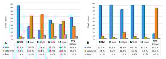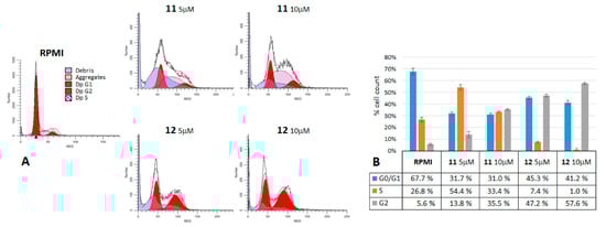 To determine whether compounds 11 and 12 could interfere with the cell cycle progression, a propidium iodide staining of the treated cells was performed and analyzed using the Tali® cytometer. The MM cells treated for 24 h with 5 and 10 μM of either 11 or 12 were analyzed using the Tali® Cell Cycle kit, as reported in the Materials and Methods. The fluorescence data were elaborated by Modfit LT4.1 software [], and Figure 8A,B shows the results obtained for the A375 cells as the example better reflecting the behavior of all five MM cell lines. After the 11 and 12 treatments, the peak corresponding to the G1 phase of the cell cycle decreased, compared to that of the control (RPMI), while the S or G2 phase peaks increased, thus suggesting a block in the G2/M transition. Such an increase denoted, indeed, a cell cycle arrest causing an accumulation of cells in the phase of DNA synthesis (S, for 11 treatments) before the completion of the duplication or just after that (G2, for 12 treatments), representing the cells that cannot pass to the mitosis phase (M), because they are blocked at the checkpoint between G2 and M. Our results confirmed that the antiproliferative activity exerted by 11 and 12 contrasting the growth of melanoma cells is related to their ability to interfere with cell cycle progression, causing it to stop in the S/G2 phases and likely taking cells to die by apoptosis.