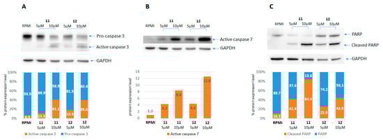 Caspases and PARP cleavage: Western blotting. Cells were treated with 5 and 10 μM of either 11 or 12 for 24 h. Cell lysates were loaded on 4–12% Bis-Tris gel, resolved on SDS-PAGE, and transferred on nitrocellulose filters, as described in the Materials and Methods. Filters were hybridized, respectively, with the following primary antibodies: anti-caspase 3 (panel A), anti-caspase 7 (panel B), and anti-PARP (panel C). The graphs represent the levels of protein expression, quantified by the UVITEC mini-HD6 imaging system, analyzed and normalized against the levels of the GAPDH housekeeping gene expression with UVITEC UVI-D1 software [].