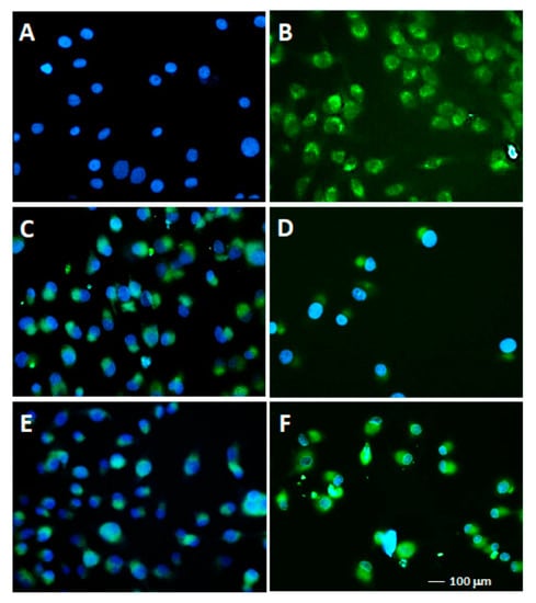 Finally, we conducted some TUNEL experiments on SK, one of the cell lines that was more sensitive to the proapoptotic activity of 11 and 12, which also showed a larger morphology. The TUNEL assay highlighted the fragmentation of DNA, resulting in the end of the apoptotic process. The SK cells were treated with 5 and 10 μM of 11 and 12 for 24 h and then processed for the TUNEL assay, as described in the Material and Methods section. As shown in Figure 7, a dose-dependent increase in green fluorescence characterized the cells treated with 11 and 12. Particularly, the cells treated with 5 μM 11 and 12 showed many fragmented nuclei with the presence of clearly visible green (fluorescein) apoptotic bodies next to the blue (DAPI) nuclei of living cells (Figure 7C,E). The 10-μΜ-treated samples displayed a lower density of the cells, many of which showed green fluorescence due to the undertaken apoptotic process (Figure 7D,F). Such a low cell density was likely due to the advanced process of apoptosis, causing the cells to detach from the slide surface while dying.