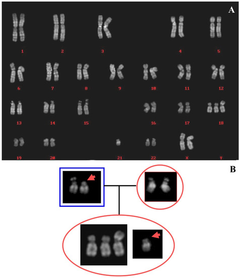 Briefly, peripheral blood metaphases were obtained from phytohaemagglutinin-stimulated lymphocytes. Amniotic fluid was cultured using standard techniques and the chromosomal preparations were performed both in suspension and in situ from independent cultures. Chromosome analysis was carried out applying QFQ or GTG banding according to routine procedures, and the karyotype was expressed following the guidelines of the International System for Cytogenomic Nomenclature 2020 (ISCN 2020) [27]. All images were captured at 100× magnification. Some of them were then enlarged photographically.