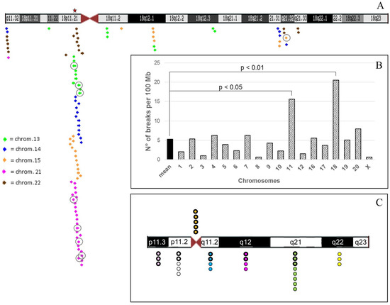 Secondly, considering the number of breaks interesting acrocentrics in relation to the size in Mb of non-acrocentric chromosomes, again chromosome 18 shows the highest number of breaks, which even exceeds that of the well-known recurrent translocation t(11;22) (20.51 vs 15.56 breaks per 100 Mb, respectively) (Tables S2 and S3, Figure 7B and Figure S2). Statistical analysis between number of breaks per 100 Mb of each chromosome and the mean value of breaks per 100 Mb of all chromosomes (mean = 5.3) revealed that only chromosomes 18 and 11 showed a statistically significant difference, more evidenced for chromosome 18 (Figure 7B, chi-square test). It should also be noted that chromosome 18 has the shortest p arm among all non-acrocentrics (Table S2).