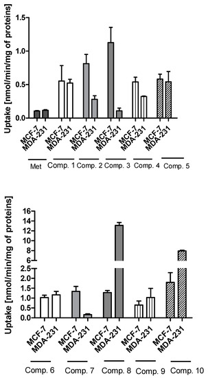 The uptake of sulfonamide derivatives of metformin (1–10) into MCF-7 and MDA-MB-231 cells at 800 μmol/L concentration after 10 min incubation at 37 °C. Results of metformin uptake in MCF-7 and MDA-MB-231 cells were presented previously [25].