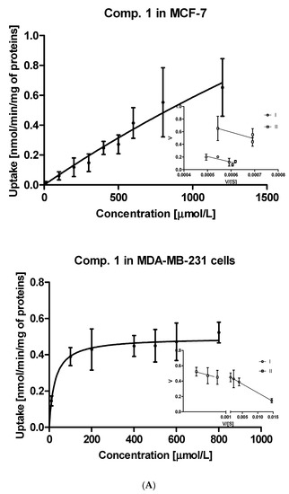 The uptake of selected sulfonamide-based derivatives of metformin (compound 1 (A); compound 2 (B)) into MCF-7 cells and MDA-MB-231 cells (at the concentrations of 10–2000 µmol/L and Eadie–Hofstee plots for OCTs mediated transport.