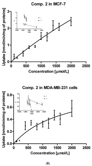 The uptake of metformin derivatives in MCF-7 and MDA-MB-231 cells was analyzed in relation to the concentration of compounds and the obtained curves were then transformed into Eadie-Hofstee plots and analyzed to calculate Km and Vmax values. The concentration contributing to the 50% of cell growth inhibition (IC50 values) were calculated using the nonlinear regression analysis (fitting the curve to log (concentration) vs. cellular response).