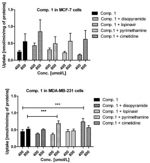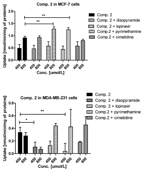 Experiments with OCTs, and MATE inhibitors were performed to explain in detail which transporters are engaged in the cellular uptake of the studied sulfonamides. The effects of selected inhibitors (at 400 and 800 μmol/L) on the uptake of compound 1 are presented in Figure 3. The uptake of compound 1 in MCF-7 cells was decreased, yet insignificantly, only in the presence of cimetidine (0.247 ± 0.044 nmol/min/mg proteins vs. 0.155 ± 0.027 nmol/min/mg proteins, p > 0.05), which suggests that OCT3 transporters might participate in the cellular uptake of 1. In turn, co-treatment of MCF-7 cells with compound 1 and disopyramide resulted in higher uptake of 1 (0.553 ± 0.201 nmol/min/mg proteins vs. 0.846 ± 0.354 nmol/min/mg proteins, p > 0.05), which indicates that another medium-affinity transporter is used, when the OCT1 transporter is inhibited. Thus, it can be presumed that disopyramide hinders the studied compound to bind to OCTs and forces them to use other high capacity transporters. With respect to MDA-MB-231 cells, a significantly higher uptake of compound 1 in the presence of both lopinavir and cimetidine was observed (Figure 3). These results suggest that compound 1 is able to utilize some other higher affinity transport mechanism when PMAT or OCT3 are inhibited and that it also has affinity for PMAT. No statistically significant changes in the uptake of 1 in the presence of both disopyramide and pyrimethamine were reported in MDA-MB-231 cells, which implies that OCT1 and MATE1 are not responsible for a moderate uptake of compound 1 in MDA-MB-231 cells.
