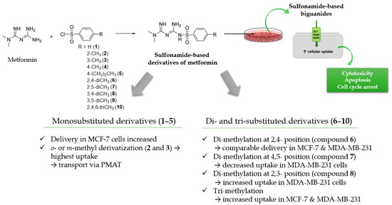 Herein, we present chemical modification of the metformin backbone into more lipophilic sulfonamides with methyl substituents in the aromatic ring as a promising approach to target OCTs, improve cellular uptake and potentiate anti-cancer effects. The uptake of ten sulfonamide metformin derivatives differing with an alkyl substituent in the benzene ring (compounds 1–10, Table 1) was comprehensively determined in two human breast cancer cell lines, MCF-7 and MDA-MB-231. Furthermore, the effects of metformin derivatives on the inhibition of cancer cell growth were reported. A few compounds were selected for determination of their mechanism of action based on the results of intracellular uptake and cytotoxicity screening. Hence, this study illustrates how the chemical transformation of the biguanide scaffold into sulfonamides, subsequent greater affinity towards OCTs, and OCT-mediated cellular uptake can improve cytotoxicity of the parent drug, metformin.