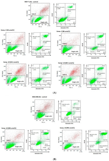 Effects of selected compounds on MCF-7 (A), and MDA-MB-231 (B) cells viability and apoptosis. (A) The cytograms in the upper line are representatives for control MCF-7 cells, the cytogram on the left side—A forward scatter width (FSC-W) vs. forward scatter area (FSC-A) of the analyzed cells. Based on FSC-A parameters, single cells were divided (in the lower part of cytogram), and marked with gate B. The single cells in gate B were analyzed for staining with Annexin V and propidine iodide. Cytograms on the right side—annexin V (x-axis) vs. propidium iodide (y-axis) plots from the gated cells B show populations corresponding to living cells (annexin V (−) and PI (−)) (E − −)—the lower-left square; early apoptotic cells (annexin V (+) and PI (−)) (E + −) the lower right square, late-apoptotic cells (annexin V(+) and PI (+)) (E + +) the upper right square, and necrotic cells (Annexin V (−) and PI (+)) (E − +) the upper left square. Cytograms in the lower line are representatives for compound 2 at 44 and 88 µmol/L, and compound 10 at 24.2 µmol/L and 48 µmol/L. (B) The cytograms in the upper line are representatives for control MDA-MB-231 cells, the cytogram on the left side—A forward scatter width (FSC-W) vs. forward scatter area (FSC-A) of the analyzed cells. Based on FSC-A parameters, single cells were divided (in the lower part of cytogram), and marked with gate B. The single cells in gate B were analyzed for staining with Annexin V and propidine iodide. Cytograms on the right side—annexin V (x-axis) vs. propidium iodide (y-axis) plots from the gated cells B show populations corresponding to living cells (annexin V (−) and PI (−)) (E − −)—the lower-left square; early apoptotic cells (annexin V (+) and PI (−)) (E + −) the lower right square, late-apoptotic cells (annexin V(+) and PI (+)) (E + +) the upper right square, and necrotic cells (Annexin V (−) and PI (+)) (E − +) the upper left square. Cytograms in the lower line are representatives for compound 10 at 496 µmol/L and 992 µmol/L.