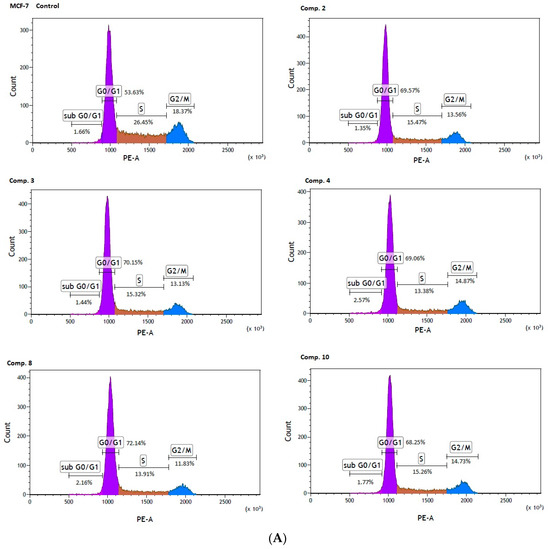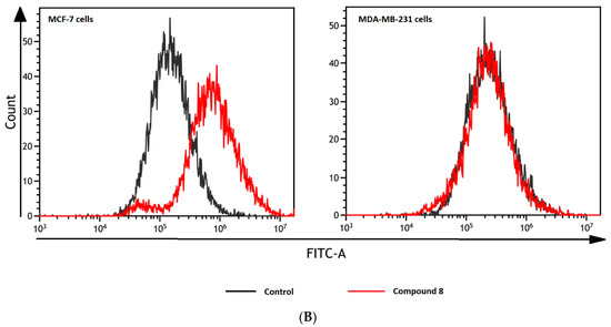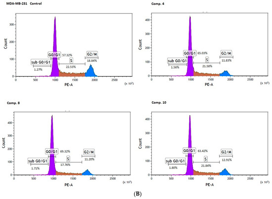 Significant changes in cell cycle arrest were also reported in the case of MDA-MB-231 cells. An analysis of the cell cycle distribution showed a significant increase in the percentage of cells at the sub G0/G1 (1.83 ± 0.21% versus 1.40 ± 0.14 for control, p < 0.05), and the G0/G1 phase (70.32 ± 1.95% versus 57.09 ± 0.91% for control, p < 0.01) in MDA-MB-231 cells treated with compound 8. Simultaneously, a significant reduction in the percentage of cells arrested in the S, and G2/M fraction were observed (Table 6, Figure 7B). These results are of extreme importance given the fact that cells in the S phase synthesize DNA and have DNA content between 2N and 4N, while in the G2 phase, the cell is prepared for the M phase, during which the cell divides into two separate daughter cells.