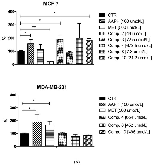 MCF-7 and MDA-MB-231 cells were cultured according to the procedure described in Section 3.6. After 24-h incubation, the cells were exposed to the tested compounds at concentrations equaling ½ of IC50 value of each compound or metformin (500 µmol/L) as reference substance. 2,2’-Azobis(2-amidinopropane) dihydrochloride (AAPH; (Sigma Aldrich, St. Louis, MO, USA) was used as positive control. After 24 h treatment, control and treated cells were collected to Eppendorf tubes, and centrifuged (5 min, 1100 rpm). The cells were washed with cold staining buffer (Biolegend, London, UK) followed by 30 min incubation with 2 µL of H2DCFDA (2′,7′-dichlorodihydrofluorescein diacetate; Thermo Fisher Scientific, Waltham, MA, USA) (final concentration 2 µmol/L). The fluorescence of the samples was measured by flow cytometry (CytoFlex, blue laser, 480 nm, Beckman-Coulter, Indianapolis, IN, USA), and the results were analyzed using Kaluza 2.1 (Beckman-Coulter, Indianapolis, IN, USA) software. 10,000 cells were analyzed from each sample (plate well) and the data are presented as the mean ± SD, n = 3. The coefficient of variation for the assay was determined (CV = 8.68%, n = 3).