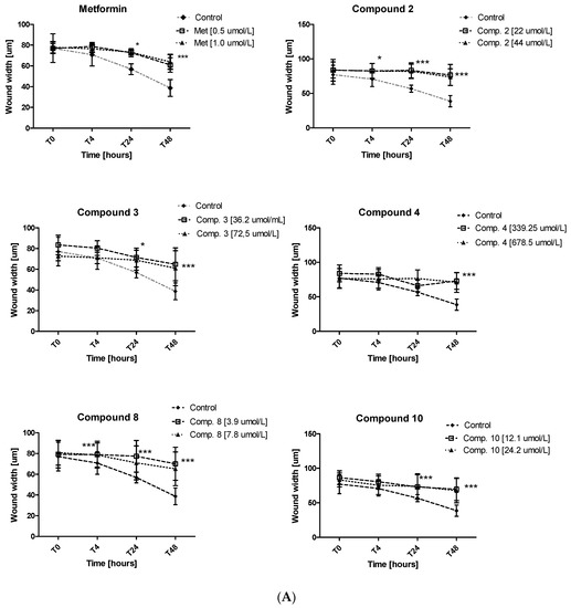 Excessive ability of cancer cells to migration plays a significant role in cancer invasion and metastasis. Herein, the potential of metformin and its sulfonamide derivatives to affect MCF-7 and MDA-MB-231 cell migration was determined using in vitro wound healing assay. After causing a wound, both cell lines were exposed to different concentrations of the studied compounds for 48 h. The ability of biguanides of affecting MCF-7 and MDA-MB-231 cell migration was inspected microscopically after 4, 24 and 48 h of treatment. The potential of attenuating MCF-7 cell migration of compounds 2, 3, 4, 8 and 10 as well as the potential of attenuating the migration of MDA-MB-231 cells by compounds 4, 8, 10 are depicted in Figure 9. Numerical data are presented in Tables S4 and S5 (Supplementary information). Metformin at 500 and 1000 µmol/L was found to substantially affect MCF-7 cell migration after 24 and 48 h of co-treatment. For instance, 48-h incubation with metformin (1000 µmol/L) resulted in a greater wound width in comparison to unstimulated cells (73.11 ± 2.28 µm vs. 56.84 ± 5.13 µm for control, p < 0.05). These results are in line with other data which show that metformin inhibits cancer invasion and metastasis, and therefore can improve prognosis of cancer patients treated with metformin [42].