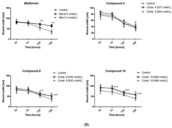 Furthermore, other tested compounds were characterized by significant properties towards inhibition of MCF-7 cell migration which were manifested by an increased width of the wound in comparison with control (Figure 9A). Figure S4 (Supplementary information) shows representative images of wound closure at 0, 4, 24 and 48 h of stimulation with selected compounds in MCF-7 and MDA-MB-231. The migration test also showed that compounds 8 and 10 significantly inhibited MDA-MB-231 cell migration, while compound 4 did not affect the wound width over the entire period of time. The greatest effect on the wound width was observed after 48 h of incubation (Table S5, Figure 9B). After 48 h of testing, approximately 58.7% of wound closure in control cells was observed, while metformin and compounds 8 and 10 demonstrated a significantly decreased ability to fill the damage area. For instance, compound 10 prevented MDA-MB-231 cell migration at both tested concentrations, starting with hour 4 of incubation (p < 0.01) (Figure 9B). These results prove beneficial properties of the tested compounds, particularly when we consider the fact that cancer invasion and metastasis transform regionally localized tumors into a systemic and lethal disease.