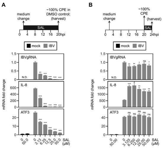 To minimize the inhibitory effect of SAL on IBV replication, in the second set of experiments, cells were treated with SAL from 20 hpi (~100% CPE) to 24 hpi. No significant dosage-dependent inhibition on the levels of IBV genomic RNA replication was observed, presumably because IBV genome replication had plateaued before 20 hpi (Figure 4B). Notably, IBV-induced IL-8 mRNA expression was significantly higher in SAL-treated cells compared with the DMSO-treated control, with a ~3-fold increase even in cells treated with 3.125 µM SAL. In sharp contrast, SAL treatment did not affect ATF3 mRNA levels, suggesting that treatment of cells with SAL for 4 h was not sufficient to activate the ATF3 transcription. It also suggests that the phospho-eIF2α-mediated IL-8 upregulation was not dependent on ATF3.