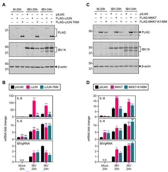 Activation of the MKK7-JNK-cJUN pathway promoted the induction of IL-8 mRNA in cells infected with IBV. (A) H1299 cells were transfected with pXJ40, pXJ40-FLAG-cJUN, or pXJ40-FLAG-cJUN-TAM, before being infected with IBV at MOI~2 or mock infected (M). Cell were harvested at the indicated time points and subjected to Western blot analysis using the indicated antibodies. Beta-actin was included as the loading control. Sizes of protein ladders in kDa are indicated on the left. (B) Total RNA samples were extracted from cells in (A) and subjected to RT-qPCR. The mRNA level of IL-8 and IL-6 was determined by the ΔΔCt method using the GAPDH mRNA of the pXJ40-transfected, 20 h post mock-infected sample for normalization. The experiment was repeated three times with similar results, and the result of one representative experiment is shown. Significance levels were presented by the p-value (ns, non-significant; *, p < 0.05; **, p < 0.01; ***, p < 0.001; N.D., non-determined). (C) H1299 cells were transfected with pXJ40, pXJ40-FLAG-MKK7, or pXJ40-FLAG-MKK7-K149M, before being infected with IBV at MOI~2 or mock-infected (M). Cells were harvested and Western blot analysis was performed as in (A). (D) Cell lysates in (C) were subjected to RT-qPCR as in (B). The experiment was repeated three times with similar results, and the result of one representative experiment is shown. Significance levels were presented by the p-value (ns, non-significant; *, p < 0.05; **, p < 0.01; ***, p < 0.001; N.D., non-determined).