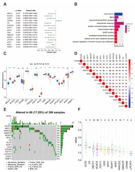 A total of 60 ferroptosis-related genes [17] were finally identified in this study. A univariate Cox regression model revealed 60 ferroptosis-related genes’ prognostic values in patients with colon cancer, in which fifteen genes (ABCC1, ACACA, CISD1, CRYAB, CS, FANCD2, FDFT1, GLS2, GSS, HMGCR, KEAP1, LPCAT3, NFS1, NOX1, PEBP1) were associated with prognosis (Figure 1A). These genes showed enrichment of biological processes related to the mitochondrion and metabolic process (Figure 1B). Figure 1C shows the mRNA expression levels of fifteen prognostic ferroptosis-related genes between normal and colon cancer samples in the GEO database. We found tumors showed a high expression of ABCC1, ACACA, FANCD2, GLS2, GSS, KEAP1, NFS1, and PEBP1 and a low expression of HMGCR and LPCAT3 compared to that of normal samples (Figure 1C, TCGA database was shown in Figure S2A). It was found that tumors with a high expression of FDFT1 showed a low expression of the CRYAB and a high expression of the HMGCR. Tumors with high expression of GSS showed a high expression of NFS1, ABCC1, and NOX1 (Figure 1D). Among 399 samples, 69 experienced mutations of 15 prognostic ferroptosis-related genes, with a frequency of 17.29%. It was found that ACACA (32/69) exhibited the highest mutation frequency followed by ABCC1 (23/69), while CISD1 as well a PEBP1 did not show any mutations in colon cancer samples (Figure 1E,F).