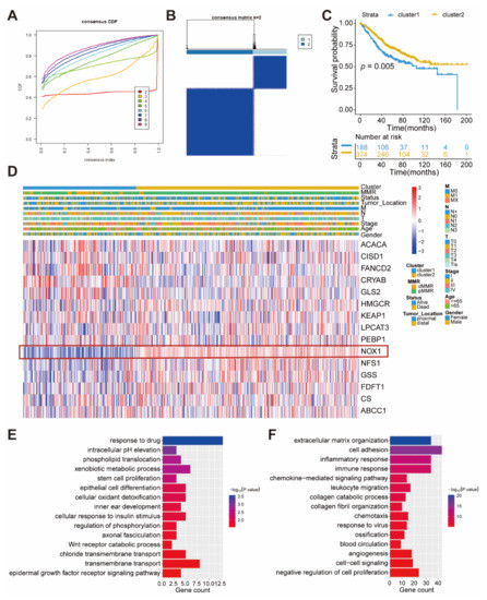 According to the expression of 15 ferroptosis-related genes associated with prognosis, patients were classified into qualitatively different molecular subgroups of colon cancer using the R software packages of ConsenesClusterPlus, and two molecular subgroups were eventually identified using unsupervised clustering, including 188 cases in cluster1, and 374 cases in cluster2 (GEO database shown in Figure 2A,B, TCGA shown in Figure S2B). Comparison of the prognoses of the two molecular subgroups of colon cancer revealed a particularly prominent survival advantage in cluster2 (Figure 2C and Figure S2D). A significant distinction existed in the transcriptional profile of the 15 ferroptosis-related genes between the two molecular subgroups of colon cancer. Cluster1 was characterized by the increased expression of ACACA, CISD1, FANCD2, and GLS2 and presented a significant decrease in NOX1. We also noted that tumors with the cluster2 had a higher expression of NOX1, NFS1, and GSS (Figure 2D). Notably, both the TCGA and GEO databases showed that cluster2 with a high expression of NOX1 had prominent survival (Figure 2D and Figure S2C,D). To further investigate each molecular subgroup’s potential biological behavior, we determined 621 differentially expressed genes (DEGs) in two molecular colon cancer subgroups. The clusterProfilter package was used to perform GO enrichment analysis for DEGs. Surprisingly, the up DEGs in cluster2 were enriched in response to drugs, indicating the patients in cluster2 are sensitive to drugs (Figure 2E). The up DEGs in cluster1 presented enrichment in pathways associated with the inflammatory response, chemokine-mediated signaling pathways, and cell adhesion. Activation of these signaling pathways in cluster1 may be conducive to the metastasis of cancer (Figure 2F).