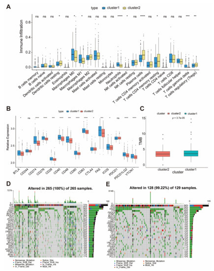The characteristics of two molecular subgroups of colon cancer. (A) The abundance of each immune cell in two molecular subgroups of colon cancer. The upper and lower ends of the boxes represent the interquartile range of values. The lines in the boxes represent median value, and the black dots show outliers. The asterisks represent the statistical p value (* p < 0.05, ** p < 0.01, *** p < 0.001, **** p < 0.0001). (B) The expression of checkpoint genes in two clusters. The upper and lower ends of the boxes represent the interquartile range of values. The lines in the boxes represent median value, and the black dots show outliers. The asterisks represent the statistical p value (* p < 0.05, *** p < 0.001, **** p < 0.0001, ns means no significance). (C) Difference in TMB between cluster1 and cluster2. (D,E) The waterfall plot of tumor somatic mutation established by those with cluster1 (D) and those with cluster2 (E). Each column represents individual patients. The upper bar plot shows TMB. The number on the right indicates the mutation frequency in each gene. The right bar plot shows the proportion of each variant type.